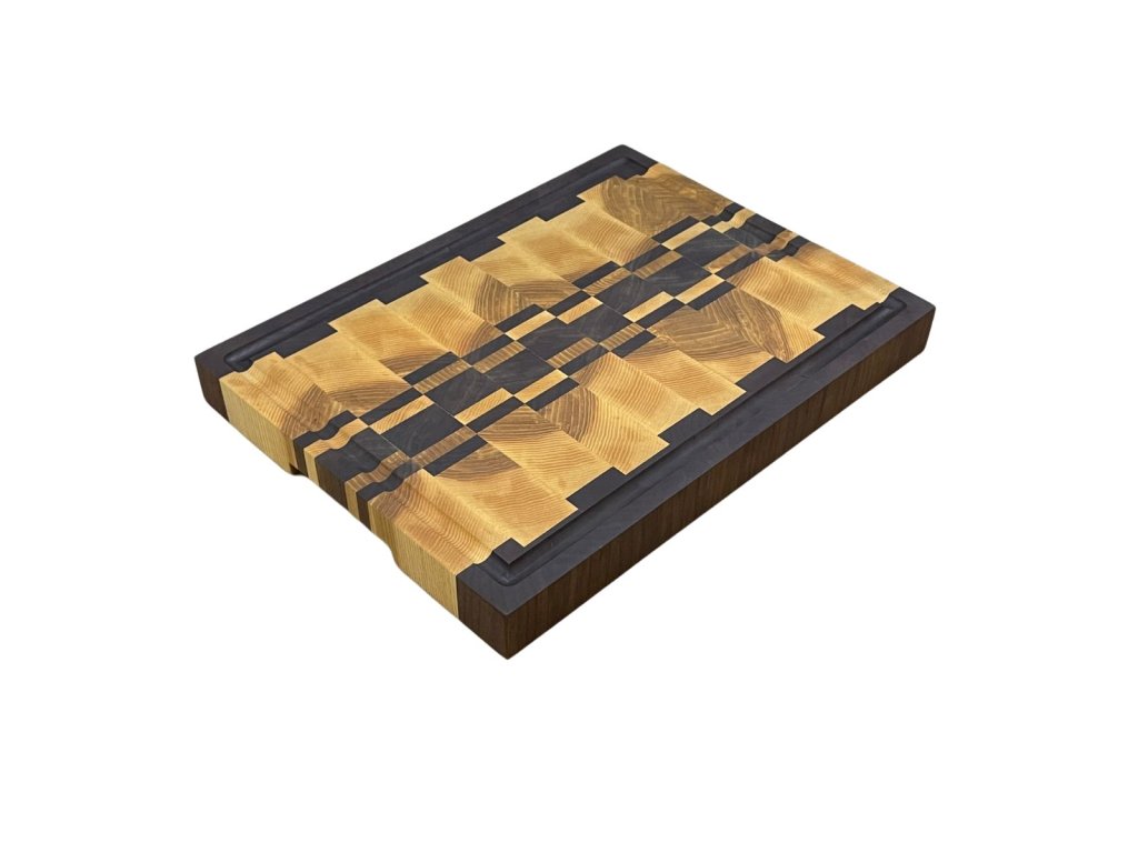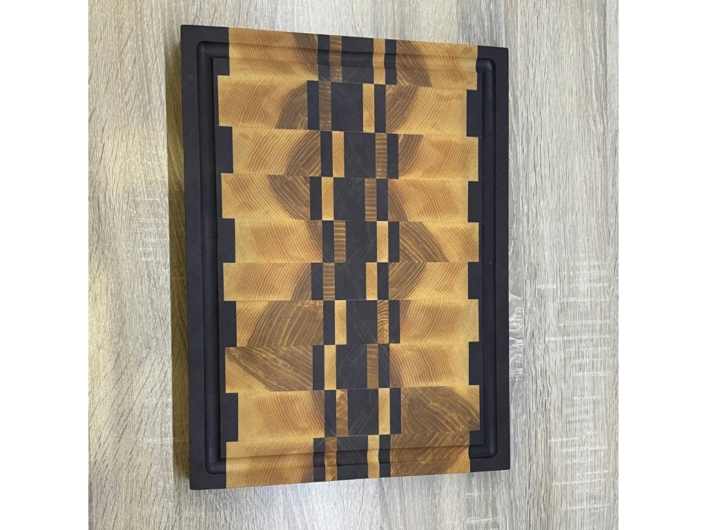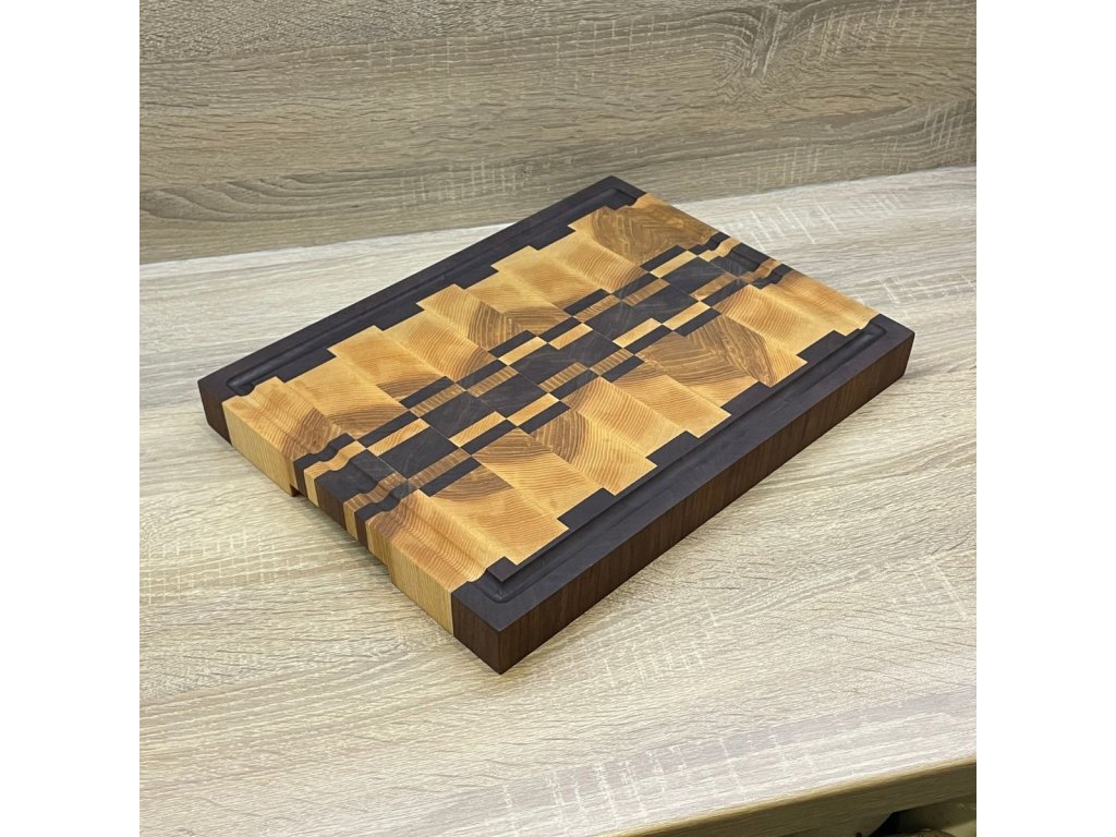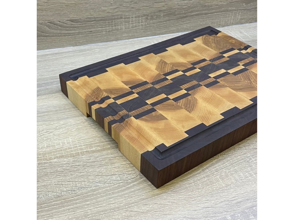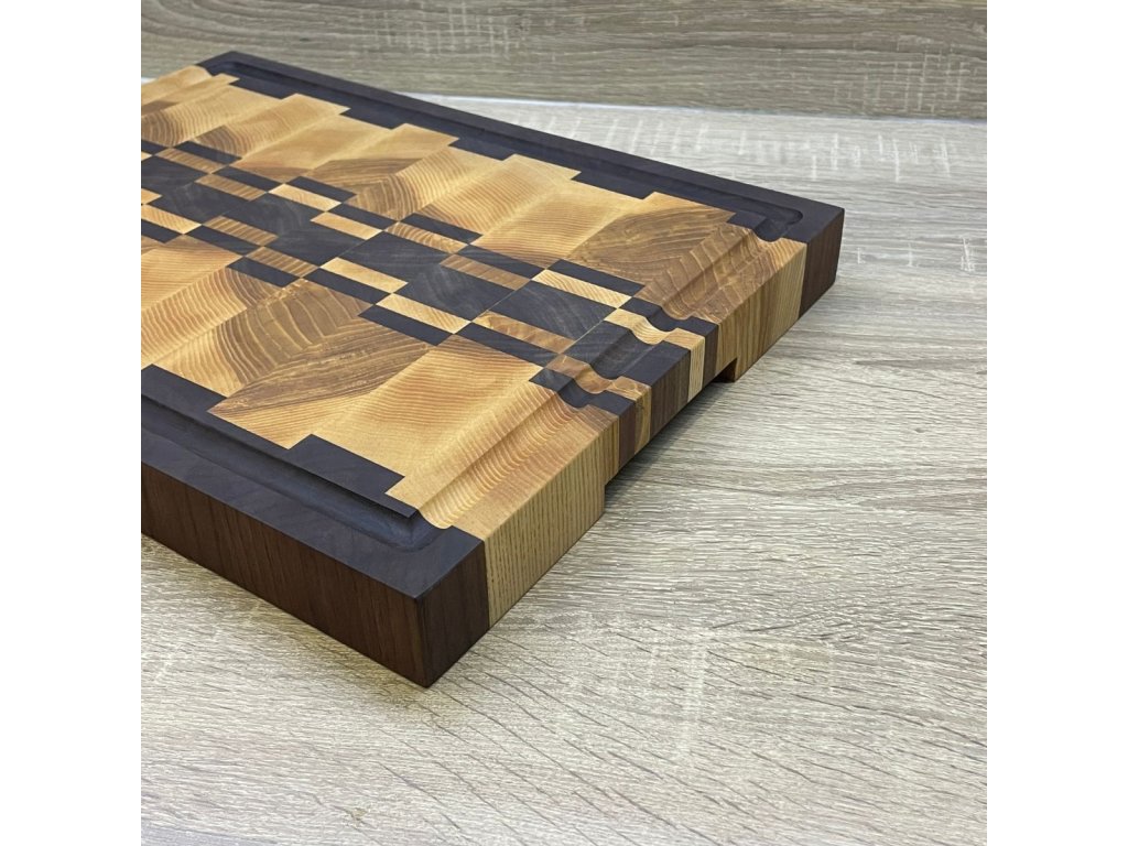 Krájecí prkénko z masivního jasanu, černého ořechu a dubového dřeva s motivem je nejen praktickým, ale také estetickým doplňkem do každé kuchyně. Kombinace těchto dvou druhů dřeva vytváří kontrastní a vizuálně atraktivní vzor.